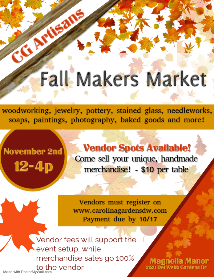 -Vendors must register and pay their $10 vendor fee by 10/17 (cash or check made payable to Carolina Gardens by Del Webb HOA, or credit card). Vendor fees will support event setup, but all craft sales go 100% to the vendor.