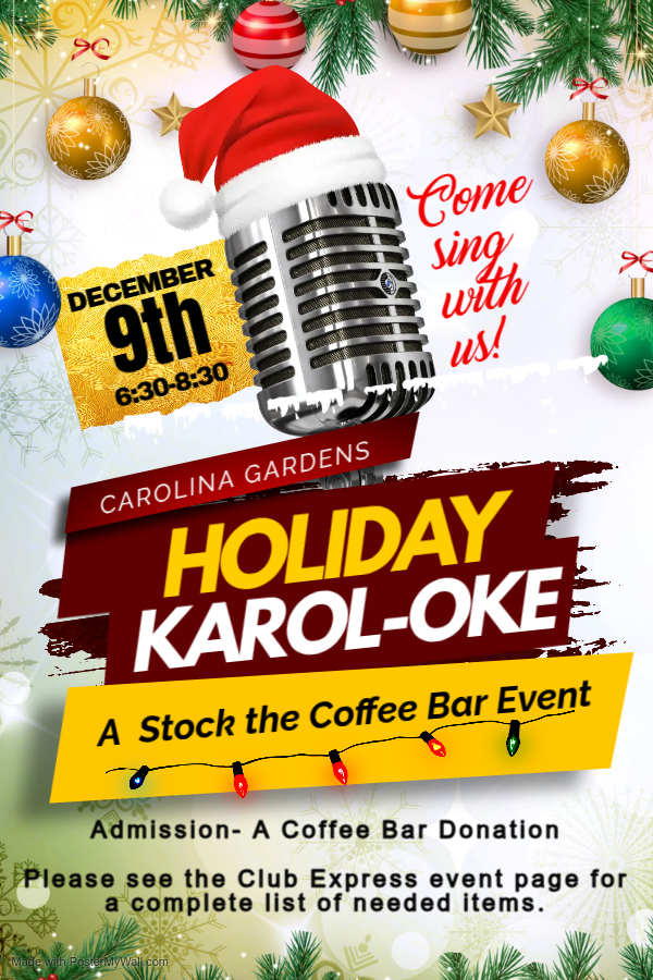 Admission: Please remember to bring a donation for the Coffee Bar. Items Needed: K-cups - regular & decaf coffee , hot chocolate Powder Creamer 12oz coffee cups Sweeteners Feel free to bring a snack. B.Y.O.B.