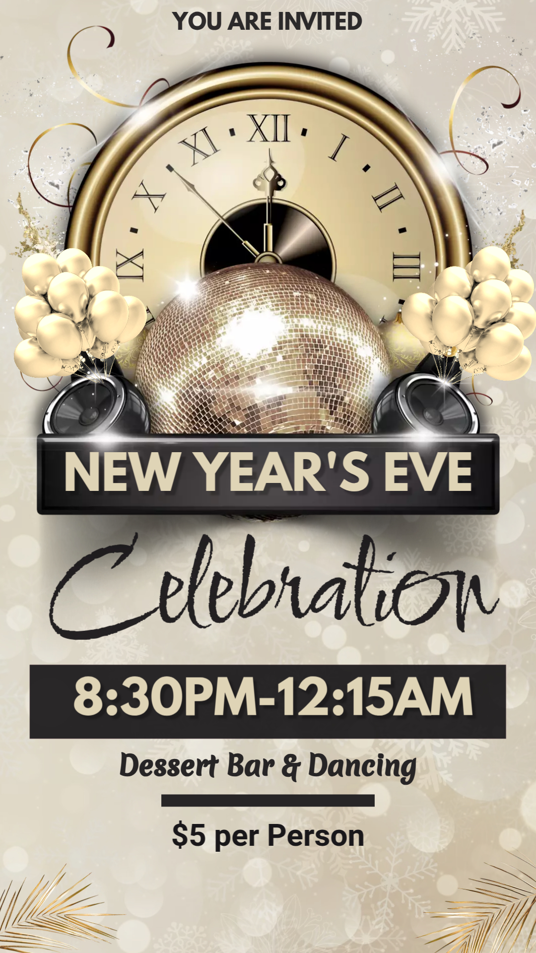 Join us for a low key affair--- Desserts & Dancing! Champagne Toast sponsored by 910 Softwash! Attire: Dress Your Best, it's the last hours of 2025! $5/person, due by 12/22 at 10a. Unpaid registrations will be cancelled at this time and registration will be closed if not filled prior. Refunds will not be issued after this time either. **PLEASE NOTE--- Hosting a NYE party until midnight is a great sacrifice for our staff as we have families we'd like to celebrate with too. For that reason, please understand that this "party until midnight" will not be an every year sort of thing.